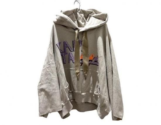 KAPITALジーンズの革ラベルに使用されている「KAP][TAL」のロゴをフロントにプリントした、ショート丈でビッグシルエットのフードスウェット。外向きの[](ブラケット)は[型にはまること]のない自由(ヒッピーマインド)の心を表しています。KAPITALの「L」をカヌーに見立てたデザインとなっています。首回りが大きくボリュームのあるフードになっており、幅広のフード紐を使用しています。袖口はカットオフ始末で軽やかなデザインです。